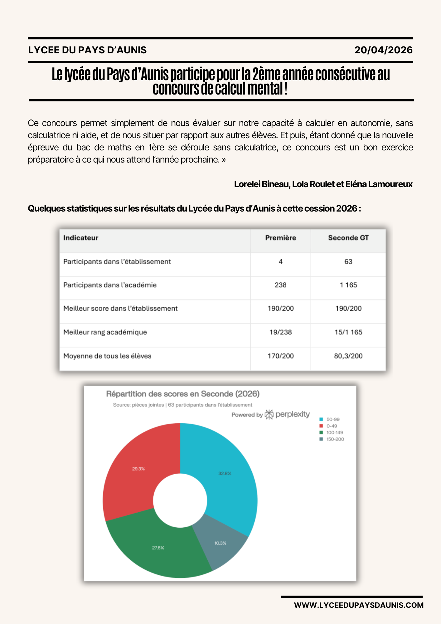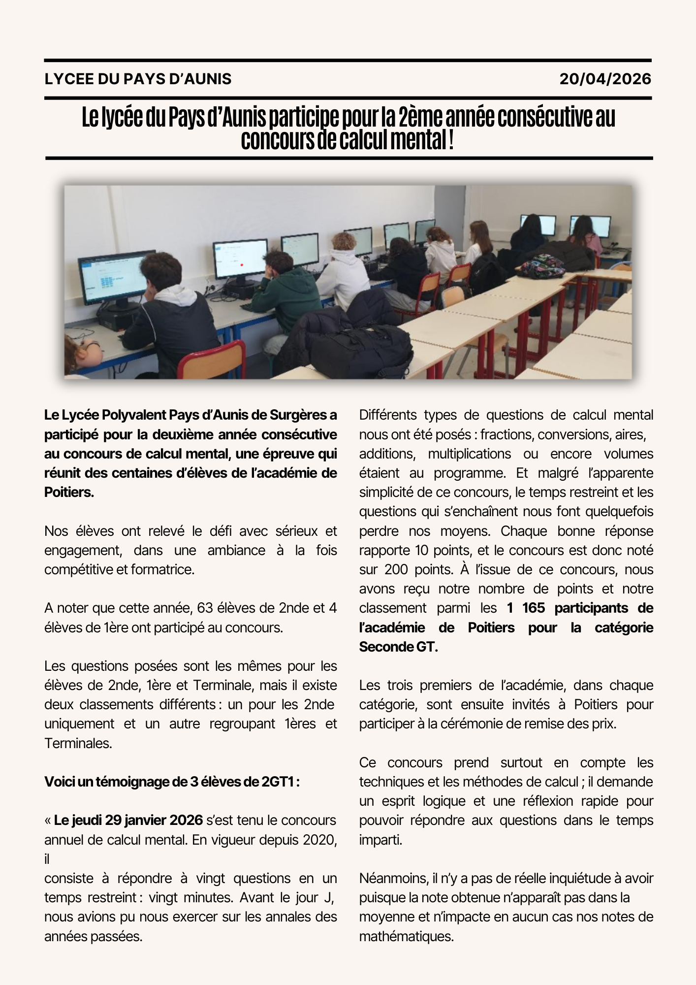 Le Lycée du Pays d’Aunis participe pour la 2ème année consécutive au concours de calcul mental!
